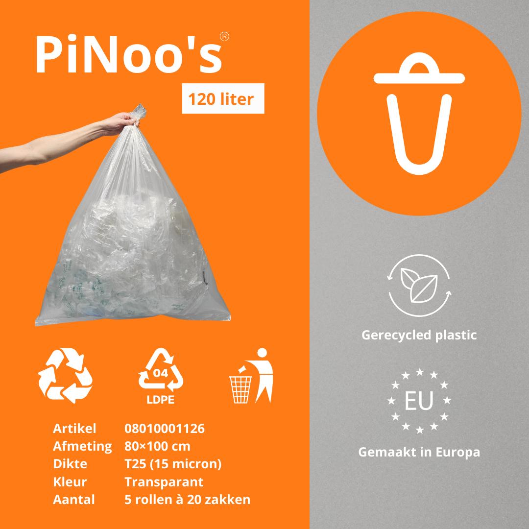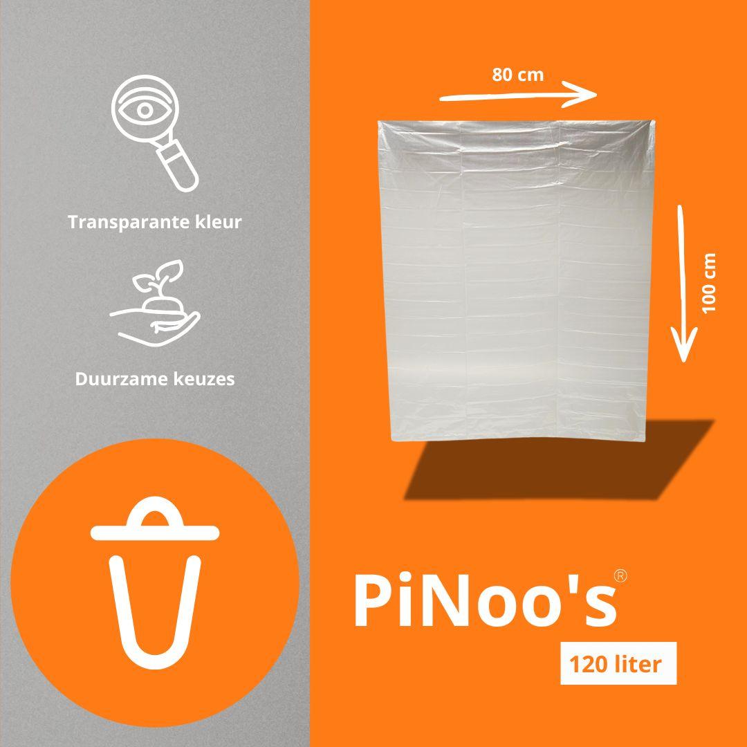 Transparante vuilniszakken van 120 liter met een standaardafmeting van 70 × 110 cm en een dikte van T25 van PiNoo’s zijn ideaal voor het verzamelen van grotere hoeveelheden licht tot middelzwaar afval in grote prullenbakken. Het ruime formaat zorgt voor een goede pasvorm in hoge afvalbakken, terwijl de transparante folie snelle controle van de inhoud en correcte afvalscheiding mogelijk maakt. Dankzij het stevige materiaal zijn de zakken geschikt voor dagelijks gebruik in onder meer kantoren, magazijnen, zorgomgevingen en huishoudens.